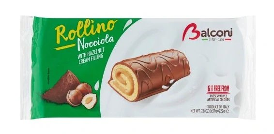- 6x piškotová roláda BALCONI ROLLINO 222 g ALLA NOCCIOLA - s kakaovou polevou a lískoořechovou náplní (6-pack)