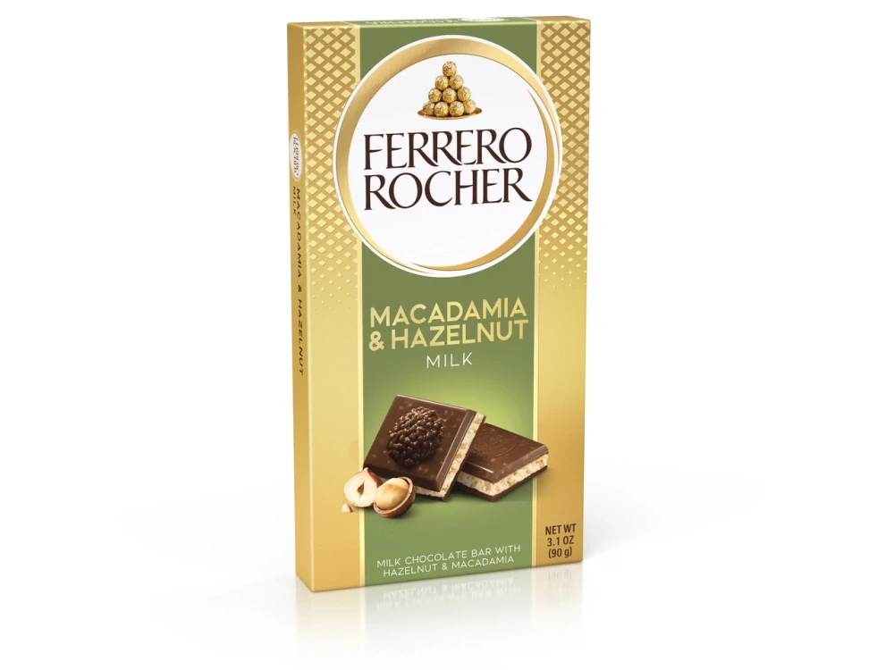 Ferrero Rocher Macadamia & Hazelnut – prémiová čokoláda s kousky lískových a makadamových ořechů pro jedinečný chuťový zážitek.