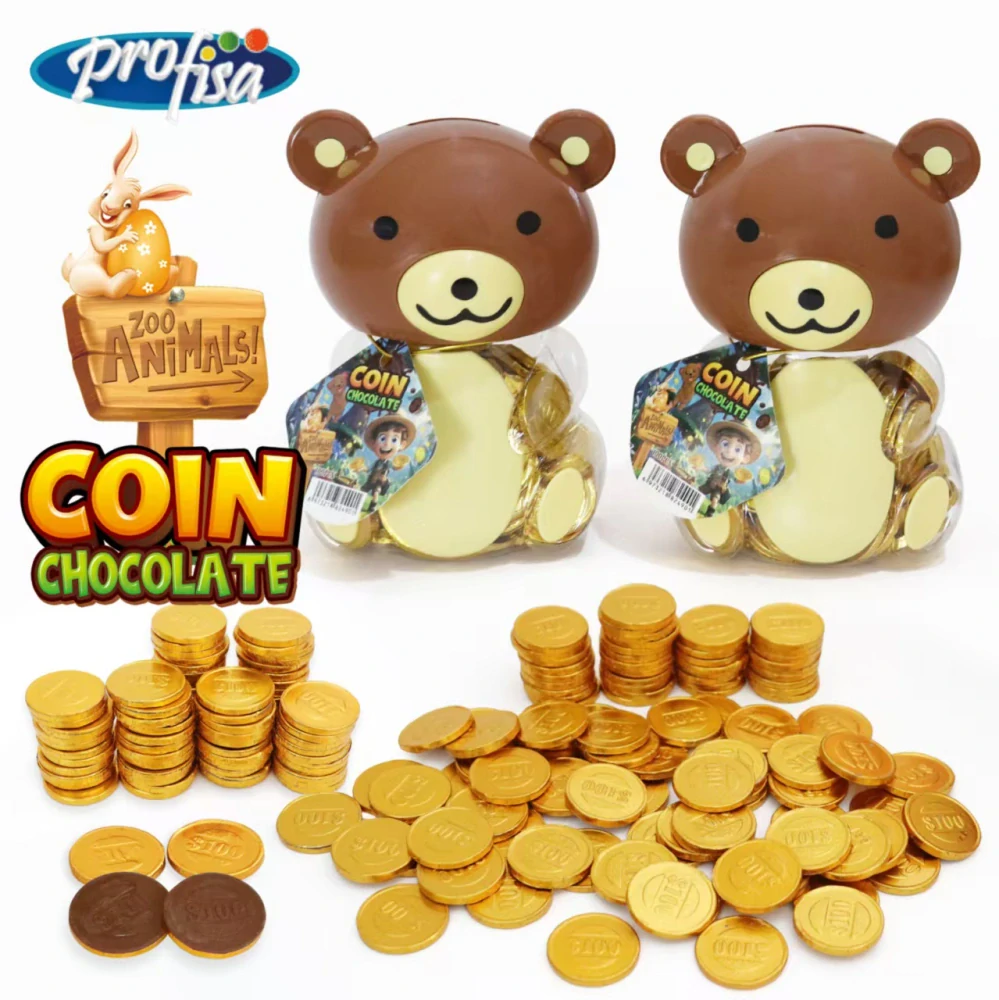 🍬 Popis produktu: Roztomilá plastová figurka zvířátka, která obsahuje 100 čokoládových mincí (průměr 29 mm) obalených ve zlaté fólii. Každá mince je mléčná čokoláda s jemnou chutí. Ideální pro děti, na párty, do školy nebo jako dárek. Dóza je zároveň kasička - velikost cca 15 cm.