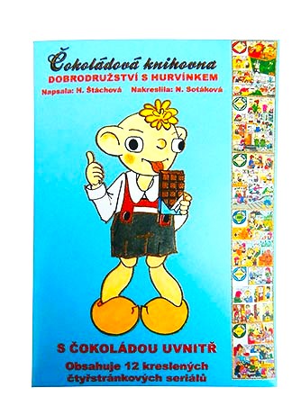 12 kreslených čtyřstránkových seriálů s Hurvínkem & 12 mléčných čokoládek, hmotnost cukrovinky 60g.
