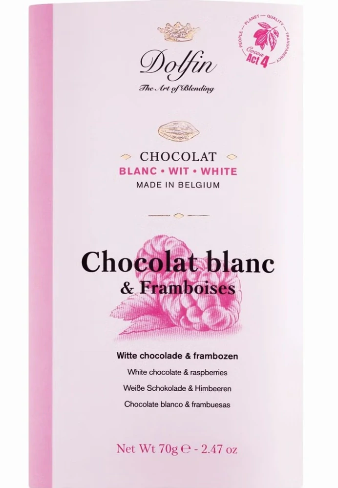 DOLFIN belgická čokoláda BÍLÁ 70g MALINY výprodej! DMT: 1/2025