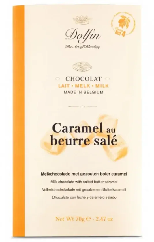 DOLFIN luxusní Belgická mléčná čokoláda s karamelem ze slaného másla . Hmotnost 70 g.