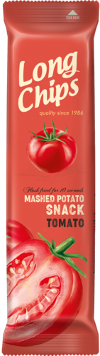 LONG CHIPS - bramborový snack - dlouhé chipsy - s příchutí rajčat.