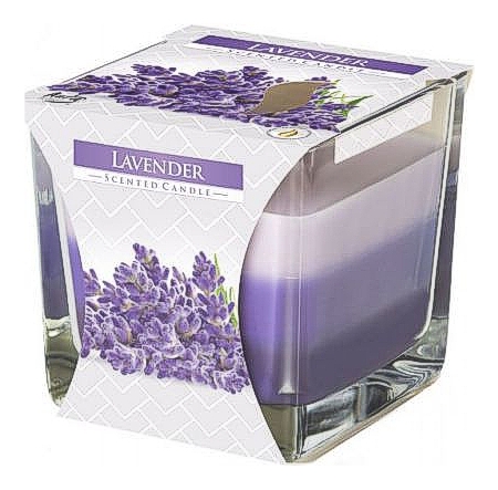 Dekorativní 3-barevná vonná svíčka ve skle s vůní levandule.