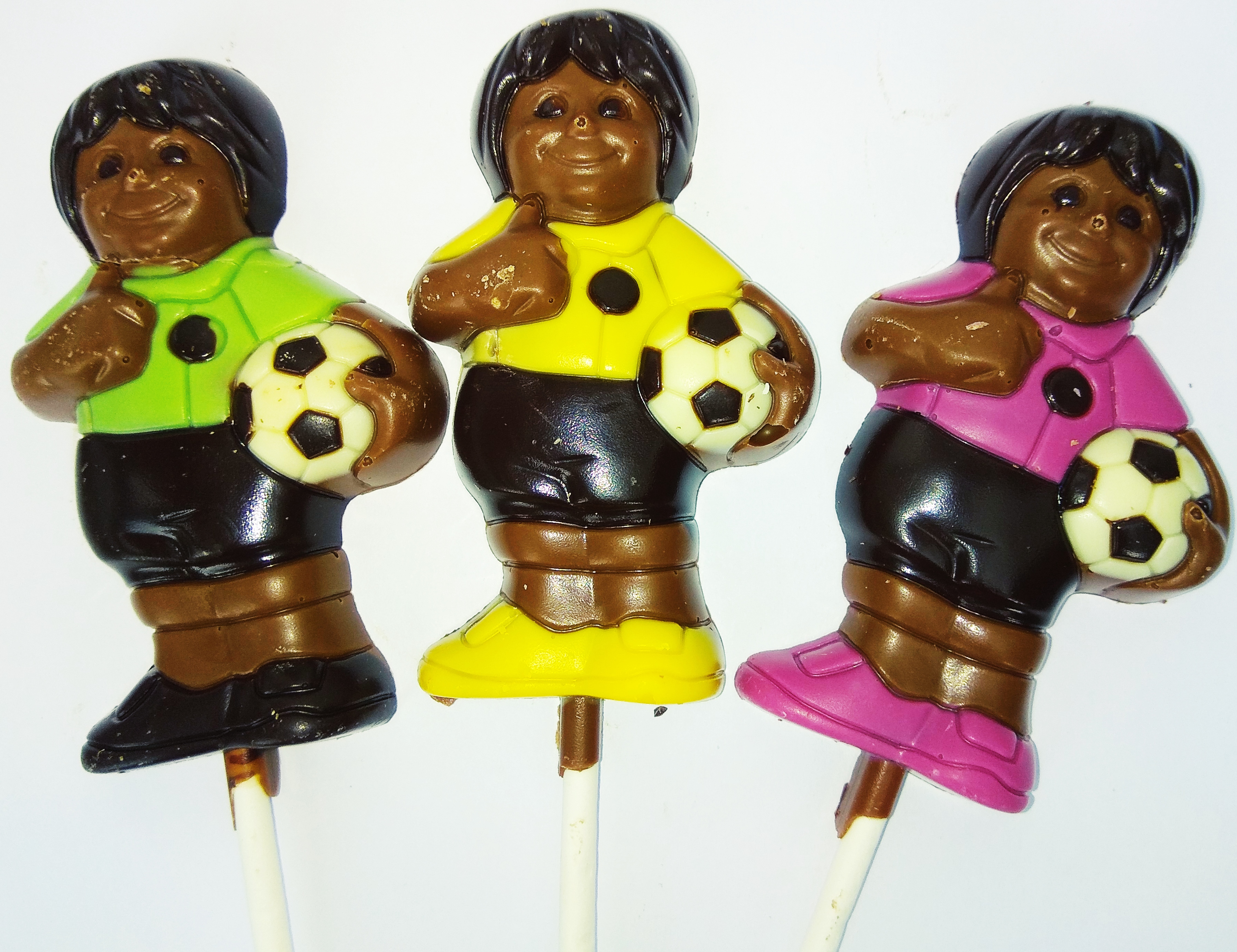 Čokoládové lízátko vyrobené z belgické mléčné a bílé čokolády ve tvaru FOTBALISTA. Hmotnost: 28g