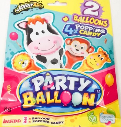 Párty dětský sáček obsahuje: 2 balónky ve tvaru zvířátek (lev, opice, žirafa, telátko) o velikosti 40 cm, dále 4 pytlíčky po 2g s práskacím práškem s jahodovou příchutí bez umělých barviv.