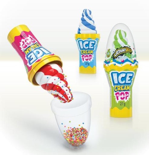 JOHNY BEE Ice Cream Pop - lízátko a cukrové bonbóny s příchutí jahody. Hmotnost 25+2g.