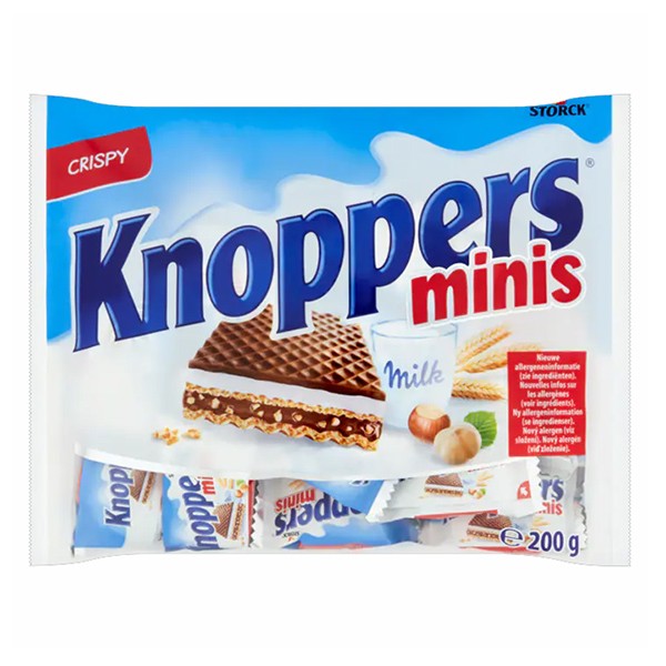 Sušenky Knoppers Minis - plněná oplatka s lísko-oříškovou (35.3%) a mléčnou náplní (30.3%).