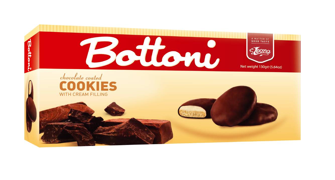 BOTTONI - Čajové sušenky s KAKAOVOU NÁPLNÍ, potažené MLÉČNOU ČOKOLÁDOU. Hmotnost 130g.