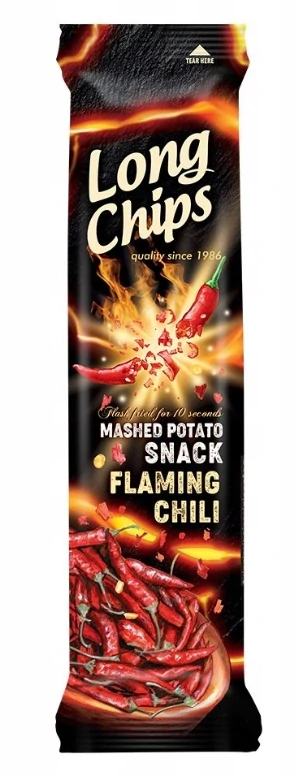 LONG CHIPS - bramborový snack - dlouhé chipsy - s příchutí ohnivého chilli.