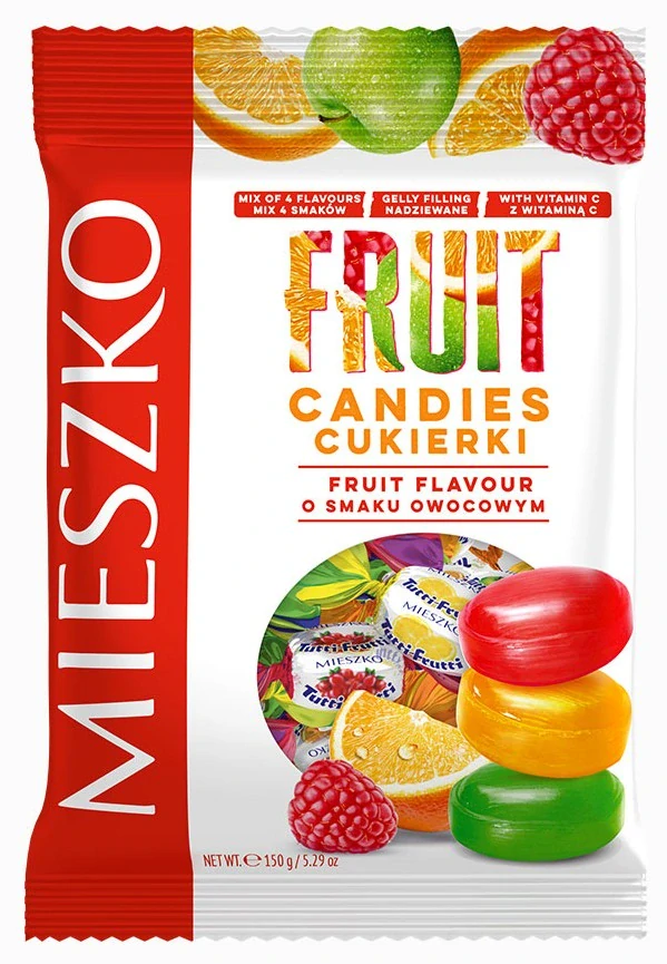 Mix bonbonů MIESZKO s ovocnými příchutěmi, želé náplní (19%) a vitamínem C. Hmotnost 150g.