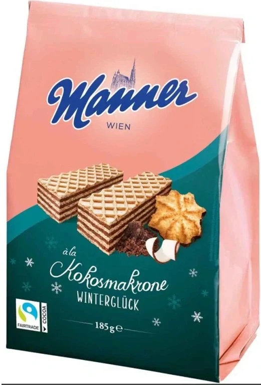 Manner oplatky "Zimní štěstí" à la kokosové makronky jsou ideálním způsobem, jak si zpříjemnit zimní období. Tyto křupavé waffelschnitten jsou naplněny krémovou kokosovo-kakaovou náplní (78%). Hmotnost 185 g.