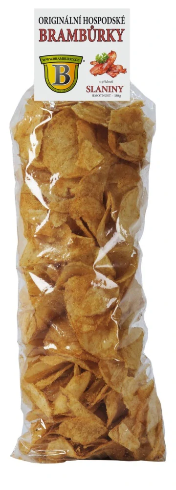 Smažené bramborové lupínky s příchutí slaniny. Originální hospodské brambůrky.