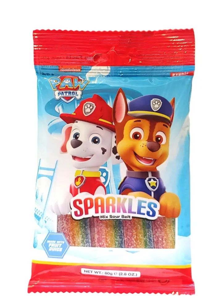 Dlouhé proužky PAW Patrol s ovocnou příchutí. Hmotnost 80 g.