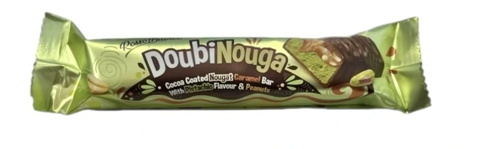- Čokoládová karamelová tyčinka DoubiNouga 50 g - s pistáciovou příchutí a arašídy