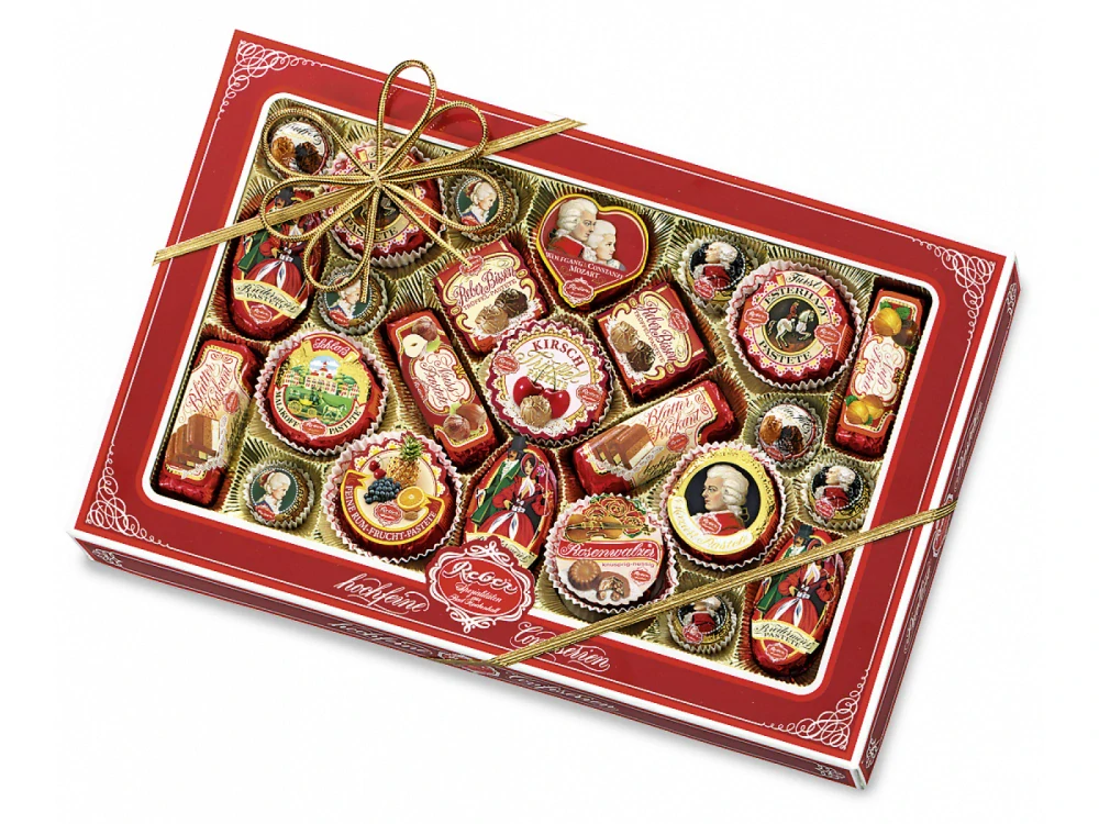 Luxusní pralinky v různých designech REBER Mozart - Schloß Malakoff pate®, Esterhazy tartlet, Reber-Bissen®, pravý Reber-Mozart-Kugel® a Constanze®-Kugel.